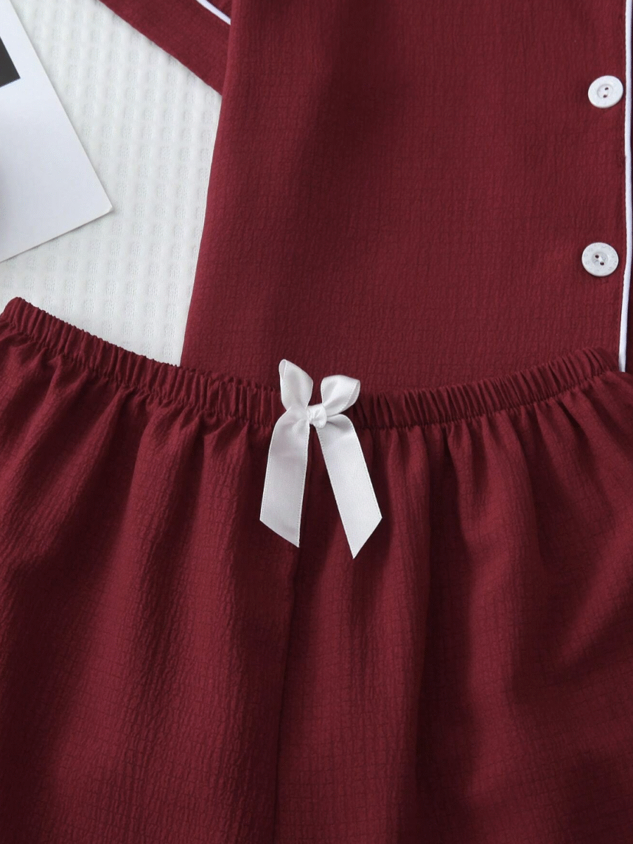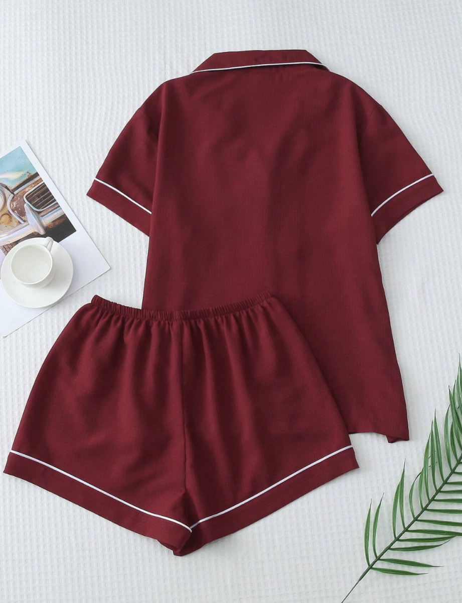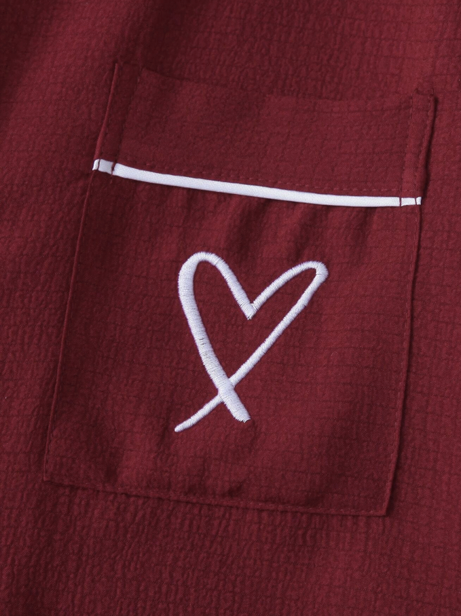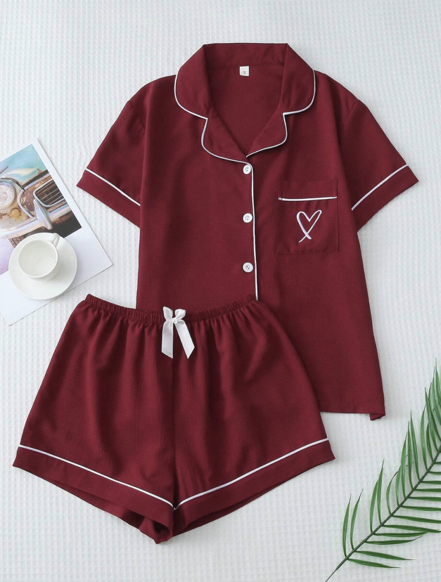 مجموعة بيجامة صيفية للنساء مكونة من قطعتين بلون أحادي مع تفاصيل فاتحة في الياقة، تطريز بقلوب، جيب، وقصيرة الأكمام مع أزرار علوية وشورت مع فيونكة، مناسبة للارتداء المنزلي