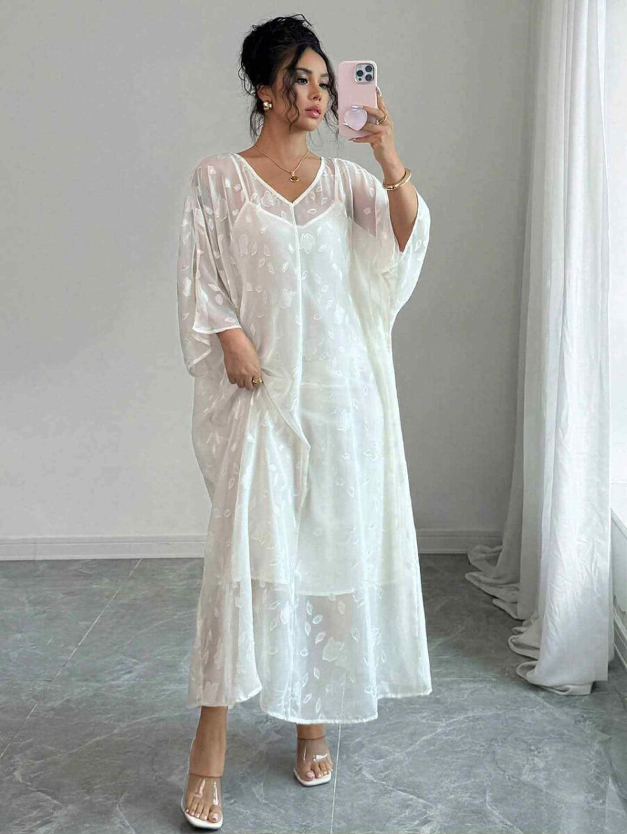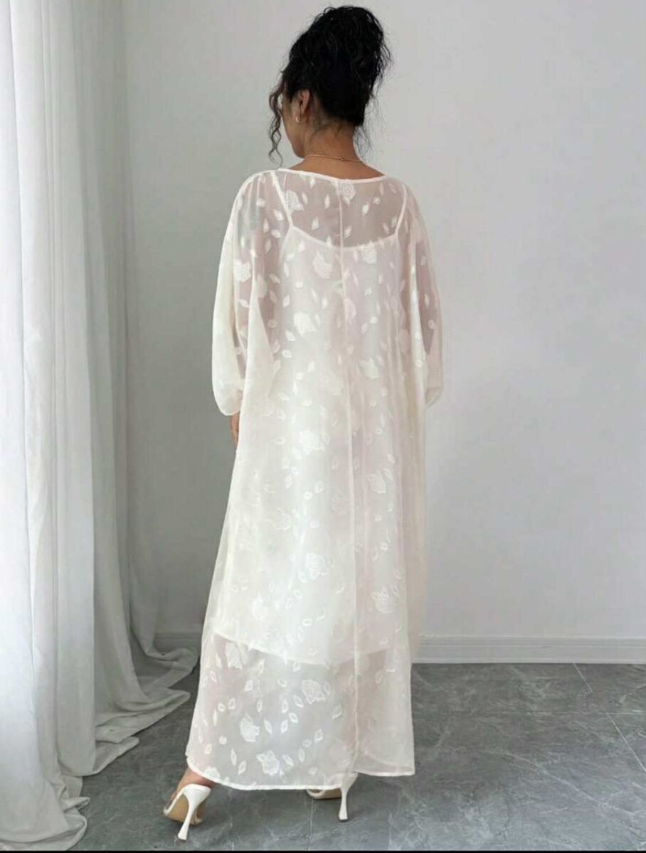 فستان أبيض نسائي من شي إن من قطعتين، حيث تتميز القطعة الخارجية بالشفافية الأنيقة بينما القطعة الداخلية مبطنة