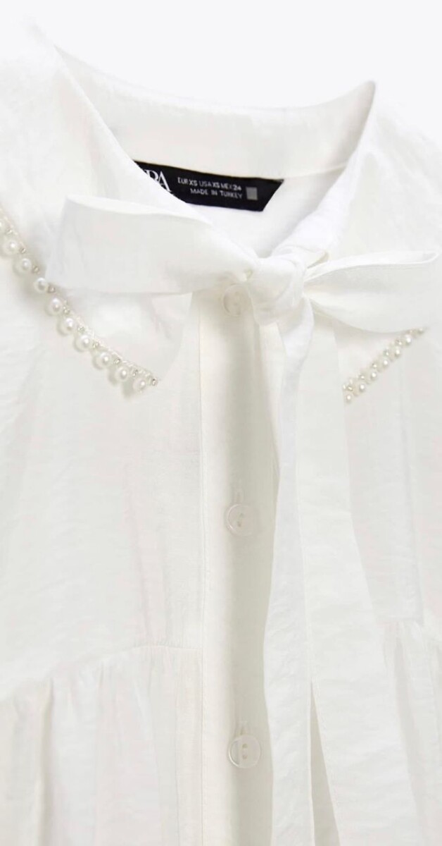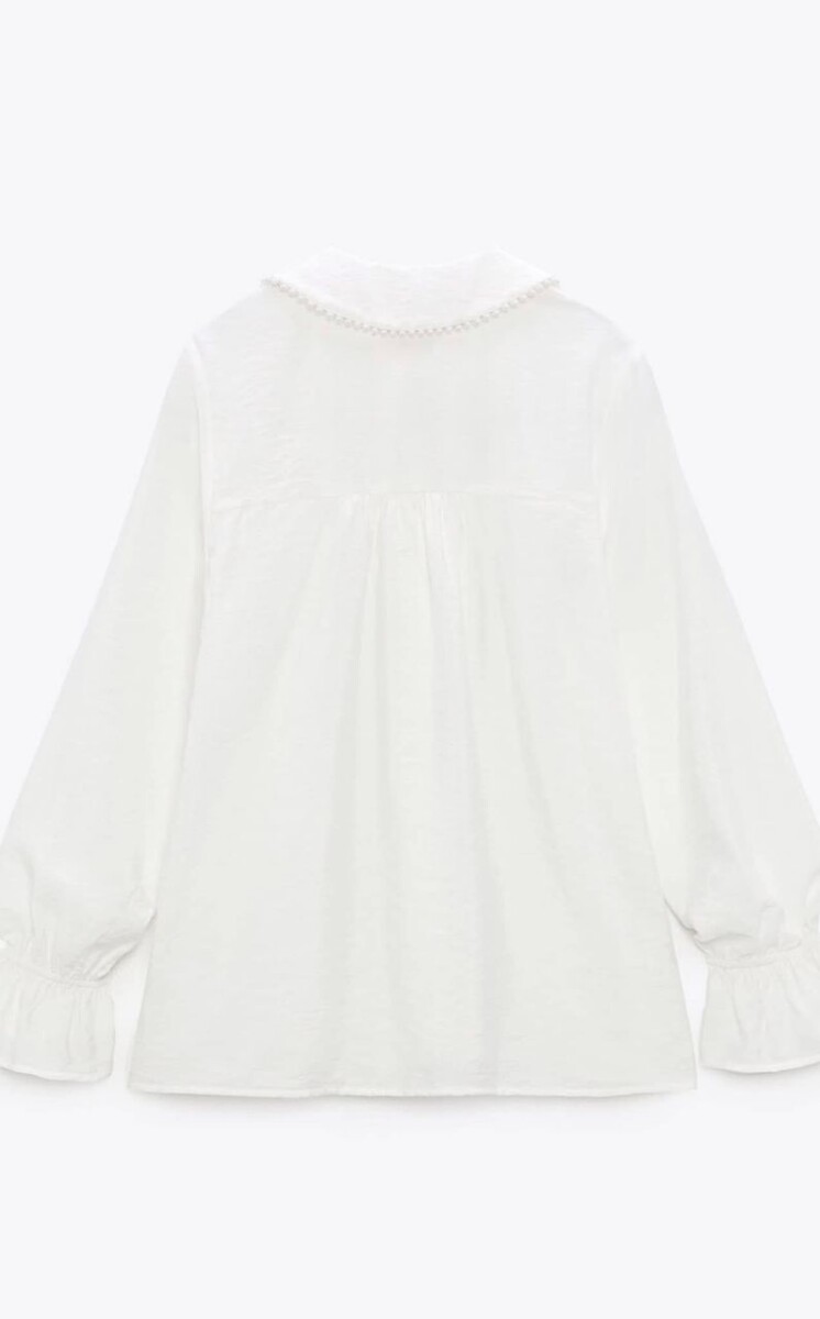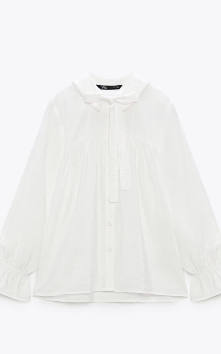 بلوزة بيضاء من زارا بتصميم أنيق، مزينة بحبات اللؤلؤ على الياقة لإطلالة ناعمة وراقية.